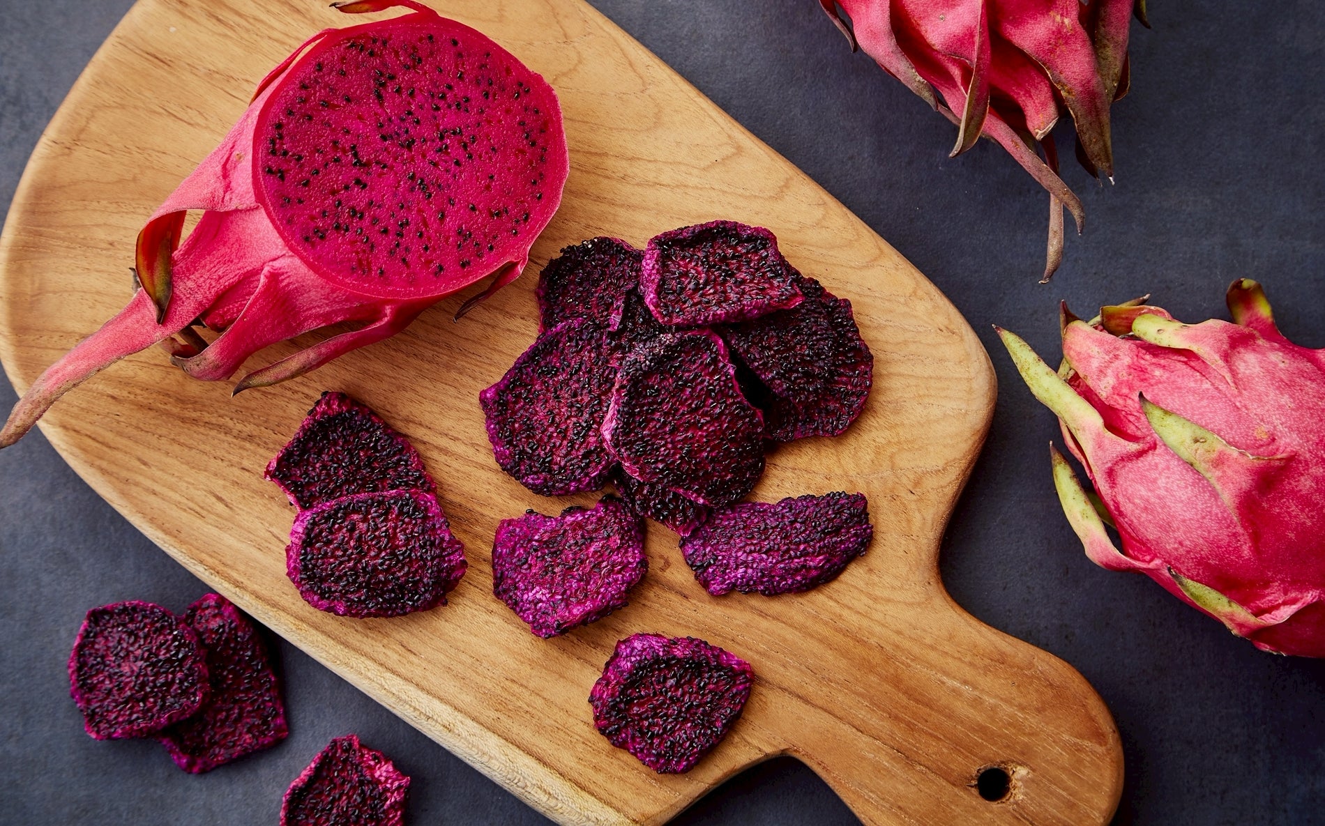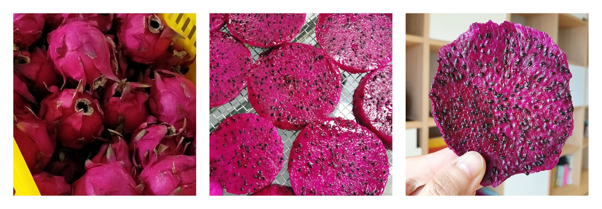 屏東産のドラゴンフルーツ。しっとりとして柔らかく、真っ赤に完熟した果実を低温乾燥することで香りと甘味の濃いドライドラゴンフルーツに仕上げました。